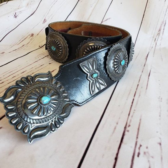 1940’s Vintage Navajo Turquoise Concho Belt. This Old Pawn Turquoise Concho Belt is one of the best condition belts we have seen. This is a unique one-of-a-kind handmade piece that is highly collectible. The sterling silver buckle and conchos were cut & hammered one piece at a time. There are 7 oval conchos with tribal design and 5 butterfly conchos.