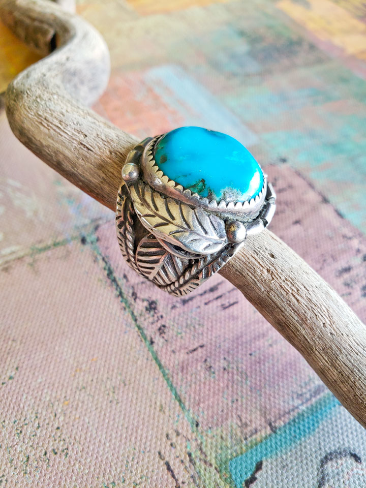 Southwestern Vintage Large Turquoise Sterling Silver Ring Signed Silver Ray. This ring features a large well preserved turquoise stone. A very comfortable ring!